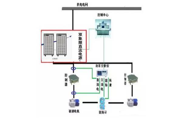 2、电机对拖测试系统;系统包括前段供电测试直流电源(电池模拟器),陪测电机电控,测试所需仪器仪表等。