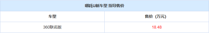 日前,我们从官方获悉,哪吒U的360联名版车型正式上市,新车仅推出1款车型,补贴后售价为18.48万元,仅限量200台。新车为400公里续航版本,几乎配备了所有可选的配置。据悉,该车需要在哪吒汽车天猫旗舰店下单,采用线上订购,线下交付的新零售方案,并且在线上下单即可享受每台3.6万元的360安全基金,让该车最终指导价格仅为14.88万元。详细车型见下表: