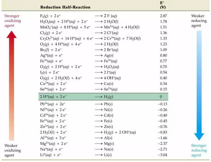 其中,φc即是这种物质表现出来的电极电位。表1中所列的标准电极电势(25.0℃,101.325kPa)是相对于标准氢电极电势的值。标准氢电极电势被规定为0.0V。