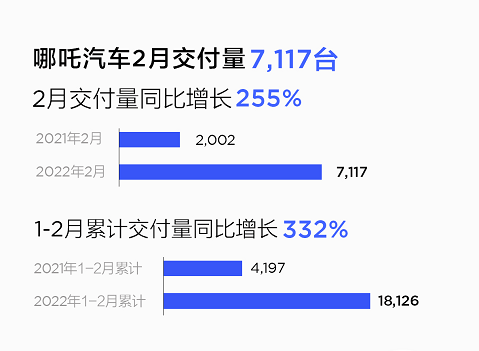 哪吒汽车2月交付汽车7,117辆,同比增长255%,首次夺得亚军,1-2月合计交付超1.8万辆,同比增长332%。具体车型,2月哪吒U Pro交付3044台;2月哪吒V车系交付4073台,同比增长103%,持续领跑造车新势力纯电SUV市场。