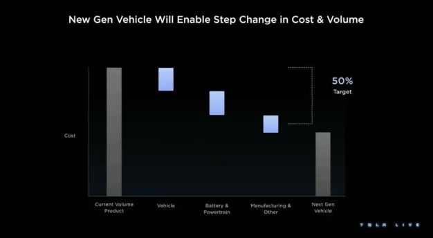 特斯拉在3月份投资者大会中,曾具体拆解其下一代平台如何完成将现有生产制造成本降低一半的目标,包括减少对价格高昂稀土元素的使用、4680电池产线的爬坡、对总装产线及热泵产线的改造升级等,涉及原材料选取、生产流程更新、大批次量产形成的规模效益等多方面,并非一蹴而就。