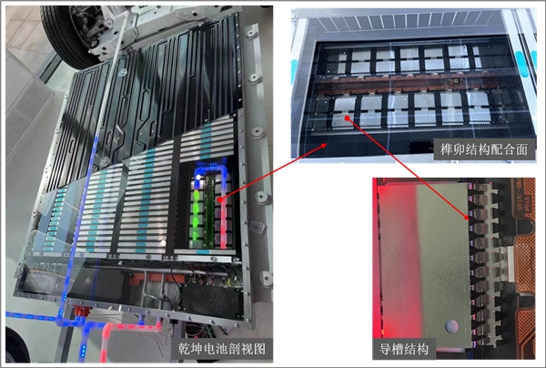 (4)热电分离江南体育怎么下载 ,这个是近两年的一个趋势方案了,乾坤电池整包采用的是电芯倒置,电芯本身则是极柱与防爆阀在异侧。由于防爆阀仍然朝上,所以乾坤电池在防爆阀上方设计了一个排泄通道,可以快速将热失控的排放导出去。