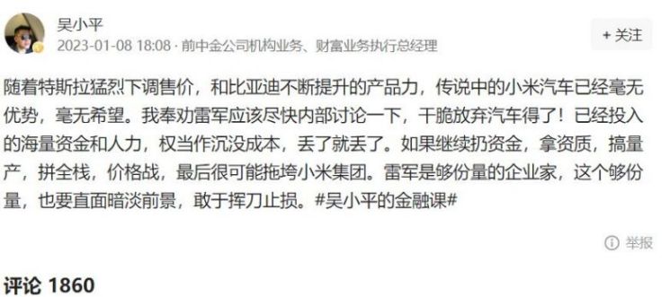 小米宣布造车后,网上持各种观点的人都有,网红经济学者吴小平甚至建议雷军放弃造车,投出去的上百亿元权当沉没成本,现在放弃还能及时止损。吴小平认为,比亚迪产品逐渐提高,特斯拉又在不断降价,再加上其他老牌车企的转型和造车新势力的崛起,小米汽车杀出重围的概率不高。
