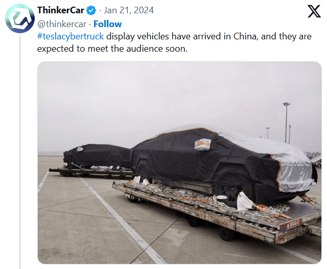 1月21日上午,ThinkerCar在X上发帖称,“Cybertruck展车已运抵中国,预计不久后将与大家见面。”ThinkerCar还配了一张图,图片显示两辆Cybertruck被装在拖车上。