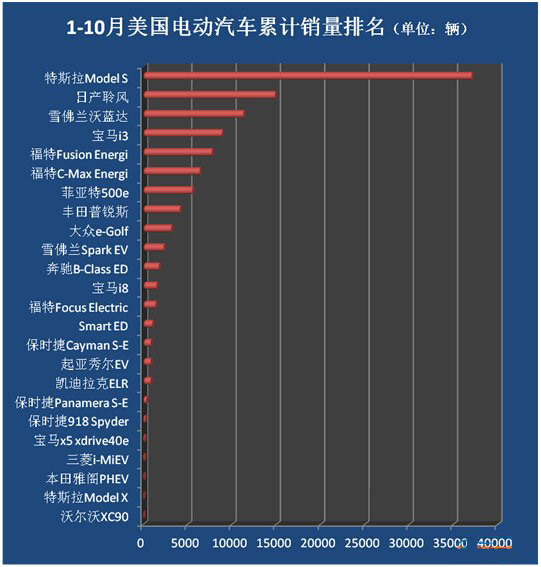 日产聆风今年前十个月在美销售14868辆,该车依然是美国市场上销量最佳的纯电动车型之一,雪佛兰沃蓝达累计销售11299辆,是美国销量最好的插电式混合动力汽车。宝马i3、福特FusionEnergi、福特C-MaxEnergi、菲亚特500e、丰田普锐斯、大众e-Golf、雪佛兰SparkEV、奔驰B-ClassED、宝马i8、福特FocusElectric、SmartED累计销量分别为8879辆、7748辆、6373辆、5539辆、4125辆、3151辆、2311辆、1768辆、1491辆、1393辆、1030辆。