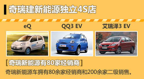 除了北汽新能源之外,奇瑞也为新能源车搭建了独立的销售渠道,拥有独立的4S店。目前,奇瑞的新能源车已经拥有80余家经销商和200余家二级销售。在奇瑞的新能源4S店中,可以买到奇瑞EQ。未来,这些4S店还将加入奇瑞艾泽瑞3EV和奇瑞QQ3EV等车型。
