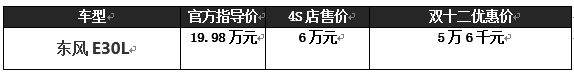 近日编辑从位于江岸区黄浦科技园兴业路特136号的武汉万帮新能源汽车体验店获悉,店内东风E30L车型现车有售,享受国家补贴后售价6万元,双十二特惠价5万6,车辆有限,5台秒杀,预购从速。感兴趣的可到店内咨询或电话咨询027-65029772.