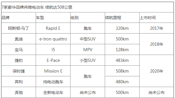 即将推出纯电动车的豪华品牌分别是宝马、奥迪、奔驰、捷豹、保时捷、宾利和阿斯顿·马丁,其中续航里程最长的是保时捷Mission E,可达到508km,奥迪e-tron quattro、奔驰全新电动车、捷豹E-Pace和宾利纯电动跑车的续航里程也均达到480km以上。