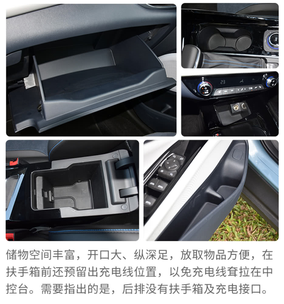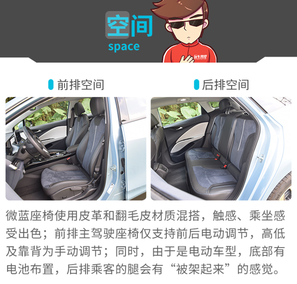 作为一台纯电动车,前后的纵向空间不成问题,无论是前排还是后排乘客都能获得充裕的腿部空间;但是由于电池被设置在车底,对后排乘客有一定影响,在后排落座后,双腿有被“架起来”的感觉,坐垫不能完全承托住大腿,有一种蜷缩在后排的感觉。