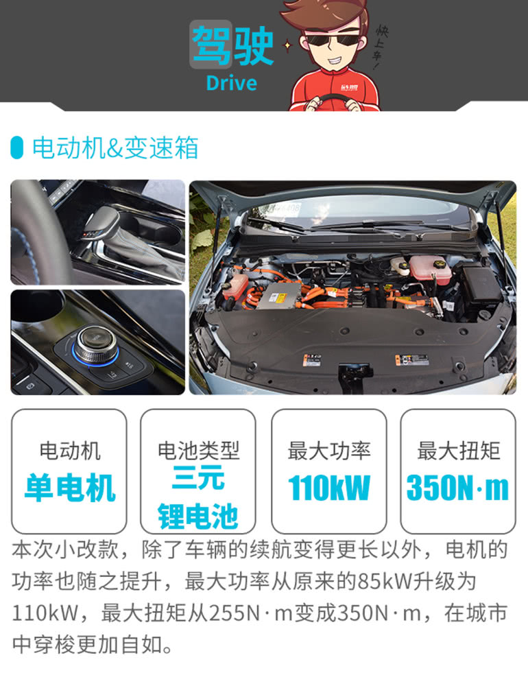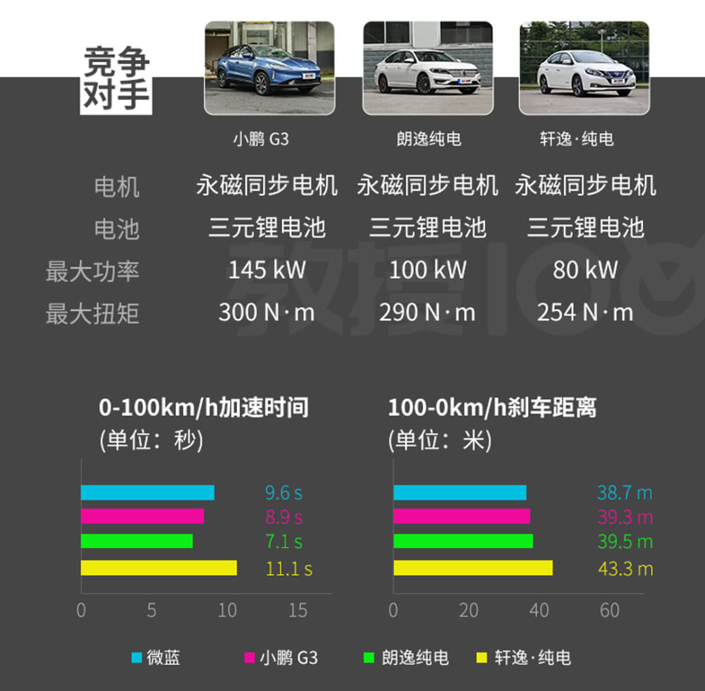 即便是加强了电机的功率,但是在0-100km/h加速过程整体趋向平淡,前段加速还算迅猛,到了后段由于电机的工作特性,再加上电机的功率不算特别大,会影响加速时间,但9.6秒的破百时间足够微蓝在城市中自由穿梭。