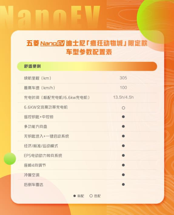 五菱联动迪士尼推出“Couple car”五菱NanoEV迪士尼疯狂动物城限定款,两座设计,综合工况续航里程达305km,不高度依赖充电桩,可直接使用家用220V三插电源充电,亦可选装6.6kw高功率充电机,4.5小时即可满电出发,且每公里花费不到6分钱。